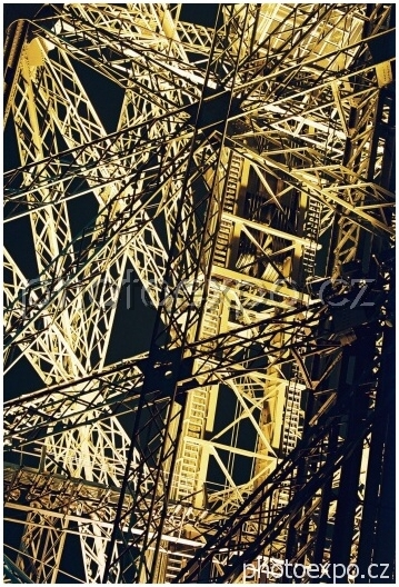 Eiffelovka je v noci dokonale nasvícená, takže lze pozorovat detaily její konstrukce.