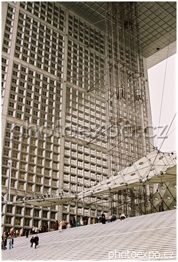 Grande Arche, nejznámější dominanta kancelářské čtvrti La Défense. Je 110 m vysoká a 106 m široká a do svých dutých útrob by dokázala pohltit celý Notre-Dame. My se necháváme vyvézt výtahem až nahoru.