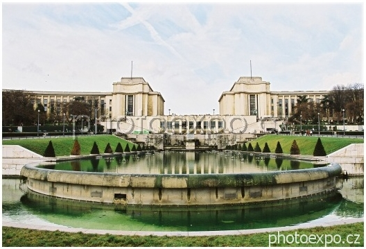 Jardins de Trocadéro na pozadí Palais de Chaillot. Aneb vodní zahrady s línými vodotrysky (pravděpodobně zimou zamrzlými) na pozadí honosného paláce.