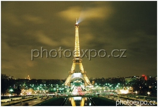 Noční nasvícená Eiffelova věž za zahradami Jardins de Trocadéro.