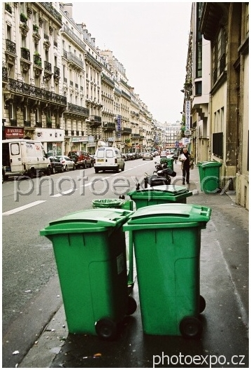 Popelnice v pařížských ulicích připravené pravděpodobně na úklid po následující silvestrovské noci.