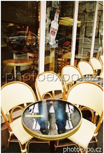Pařížské kavárny nabízejí i v zimě sezení nejen uvnitř ale i venku. Zde sice nikdo nesedí, ale díky plakátu pod skleněnou deskou stolu se může zdát že ano. Jen půlka člověka někde chybí...
