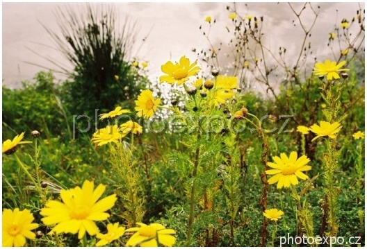 Žluté květiny na pozadí světla odrážejícího se v blízkém jezírku. Porto Pino.