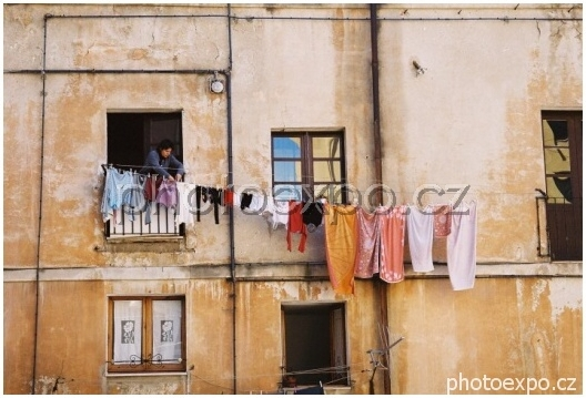 Typické věšení prádla v kladkovém stylu v romantických uličkách hlavního města Cagliari.