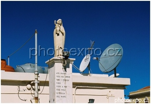 Carloforte historické i současné. Absurdní pohled na vodní nádrže a satelity namontované na moderní ploché střeše tvořící pozadí historické soše Panny Marie.