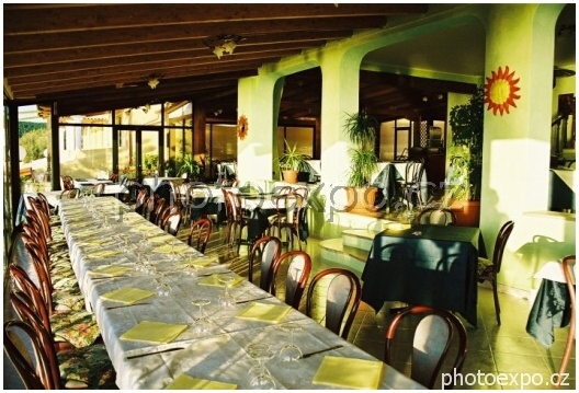 Prostorná světlá jídelna našeho hotýlku Martinelli na ostrově S. Antioco. Z jídelny jsme měli nádherný výhled na moře.