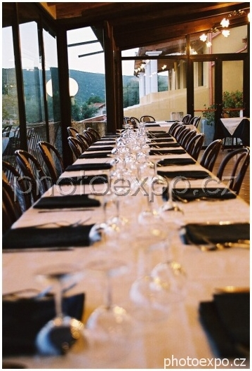 Řada sklenic v prosklené nádherné restauraci našeho hotýlku Martinelli na ostrově San Antioco.