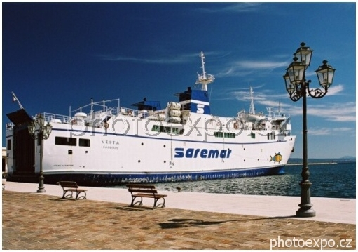 Trajekt a pouliční lucerny v přístavu městečka Carloforte, kde čekáme na zpáteční plavbu do Calasetty.