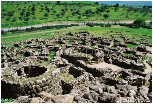 Výškový pohled na historický komplex Su Nuraxi Di Barumini. Kamenné stavby zde v letech 1 800 - 500 před Kristem zanechala tajemná nuragská kultura.