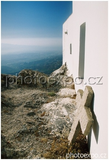 V podvečerním slunci jsme se hrbolatou cestou vyšplhali naším prvním místním autíčkem - červeným fiátkem - na horu Jouchtas (811 m), z níž se nám naskytl nádherný výhed do okolí, na fotografii lemovaný zdí minojské svatyně na vrcholu hory.