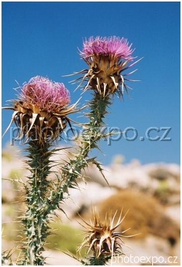 Cestou na náhorní plošinu Nida v pohoří Psiloritis zastavujeme u překrásné vyhlídky na umělou vodní nádrž a okolní krajinu. Rostou zde i tyto vysoké růžové bodláky.