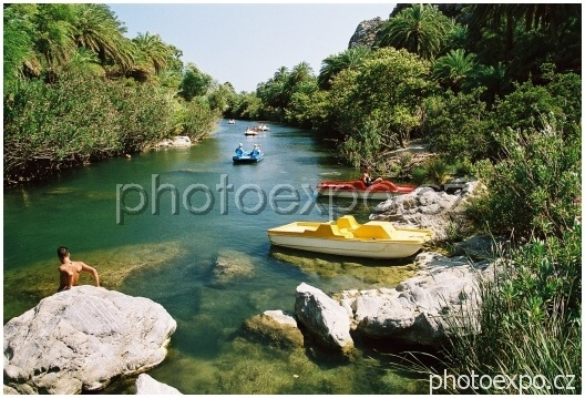 Na Palmové pláži na jihu Kréty si půjčujeme šlapadlo a vydáváme se proti proudu říčky Megalou Potamos. Nejen auta ale i šlapadla mají na Krétě jasně barevná. Šlapeme, kam to jde - tedy sem. Poté opouštím šlapadlo a přes balvany a vodopádky se vydávám, kam až to jde pěšky s foťákem na krku.