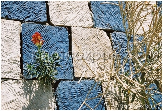 Zeď domu v typických řeckých barvách avšak v netradičním provedení z hlediska struktury zdobená živou květinou. Bali.