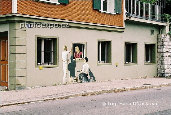 "Nemáme to okno proti těm ostatním nějak malé?" Vtipná malba na domě v Bernu, Švýcarsko.