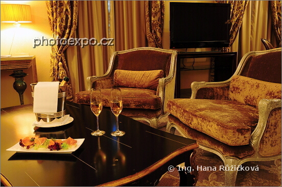 Detail z obývacího pokoje našeho apartmá v nejluxusnějším hotelu světoznámého střediska Svatý Mořic - hotelu Carlton***** - v němž jsem měla čest strávit jednu noc. Při mém příchodu na pokoj nechybělo připravené luxusní občerstvení v podobě slané i sladké, adresné uvítání na obrazovce televize a osobní vizitky s mým jménem a kontakty do hotelového pokoje. St. Mortiz, Graubünden, Švýcarsko.