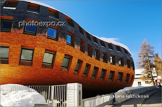 Zajímavá moderní stavba ve světoznámém středisku Svatý Mořic. Graubünden, Švýcarsko.