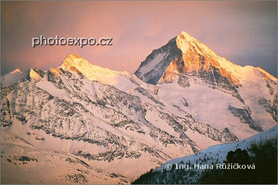 Horský masiv ve světle zapadajícího slunce - vlevo Grand-Cornier, vpravo obrovský Dent Blanche ( 4 357 m n.m.). Wallis, Švýcarsko.