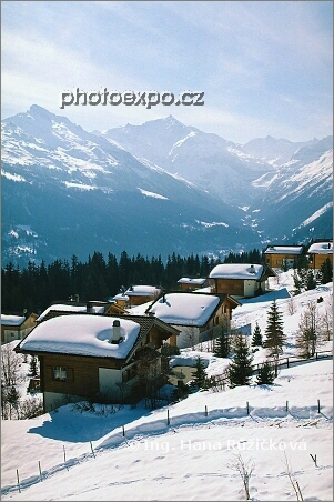 Zasněžené domky v zimním areálu La Printze pohledem z lanovky vynášející nás na vrchol Ethérolla (2 450 m n.m.). Wallis, Švýcarsko.
