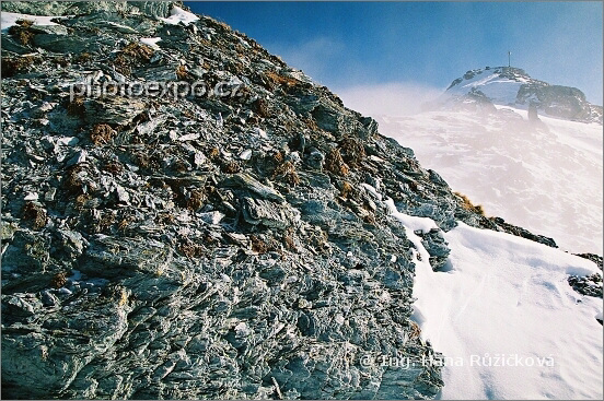 Vrchol Greppon Blancu (2 700 m n.m.) objímaný mraky a sluncem... Wallis, Švýcarsko.