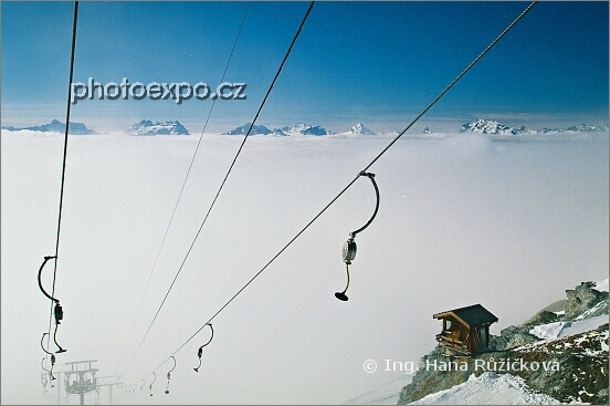 Vlekem nad mraky... V zimním areálu La Printze jsme se vyvezli na vrchol Greppon Blanc (2 700 m n.m.) a z výhledů na špičky alpských velikánů vyčnívajících nad souvislou vrstvu mraků se nám tajil dech. Wallis, Švýcarsko.