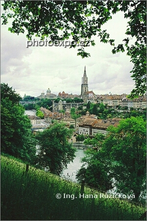 Výhledy z Anglického parku (Englische Anlagen) přes řeku Aare na staré město Bernu s katedrálou. Bern, Švýcarsko.