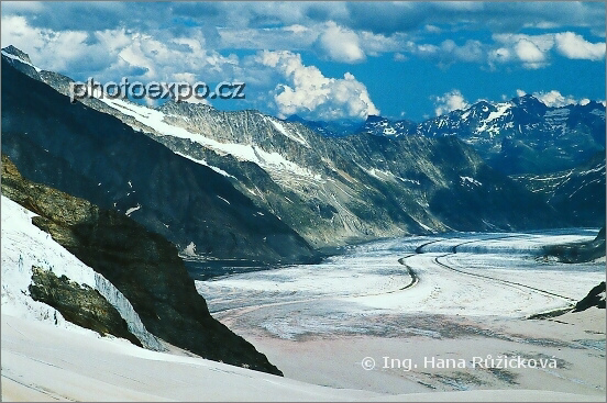 Fascinující výhled přes plošinu Konkordia na nejdelší alpský ledovec, Aletschský ledovec (25 km) z plošiny (Plateau) na Jungfraujoch (3 454 m n.m.). Wallis, Švýcarsko.