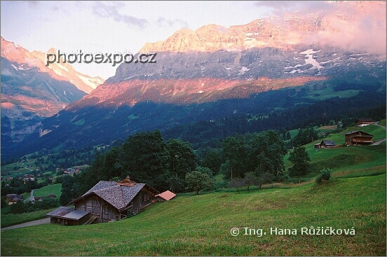Duhové kreslení paprsky zapadajícího slunce na masivu Eiger (3 970 m n.m.). Tuto nádheru jsme pozorovali při sestupu z Männlichenu do Grindelwaldu, při kterém jsme překonávali převýšení cca 1300 m. Bern, Švýcarsko.
