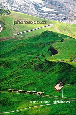 Žlutozelená lokálka z Grindelwaldu na Kleine Scheidegg (2 061 m n.m.) a nad ní dlouhý tunel pro zubačku vedoucí z Kleine Scheidegg na Jungfraujoch, nejvyšší železniční stanici v Evropě (3 454 m n.m.). Wallis, Švýcarsko.