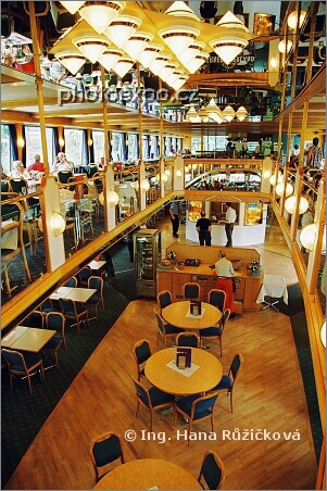 Interiér parníku Berner Oberland, v jehož 1. třídě jsme se plavili po jezeře Thunersee. Bern, Švýcarsko.