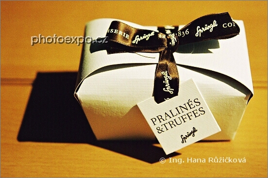 Typická "pralinkovská" krabička, do které vám zabalí ve firemní prodejně na basilejském nádraží výtečné, ručně vyráběné švýcarské pralinky Sprüngli.