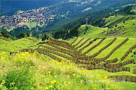Zábrany proti sněhovým lavinám a kamení na jižním svahu Männlichenu (2 343 m n.m.) nad městečkem Wengen. Bern, Švýcarsko.