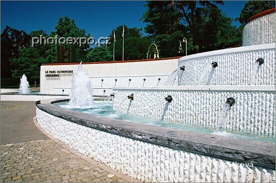 Terasovitá fontána od J. Lardeta u vstupu do Olympijského parku (Parc Olympique) v Lausanne- Ouchy symbolizuje oponu otevírající se nad pamětí Olympiády. Vaud, Švýcarsko.