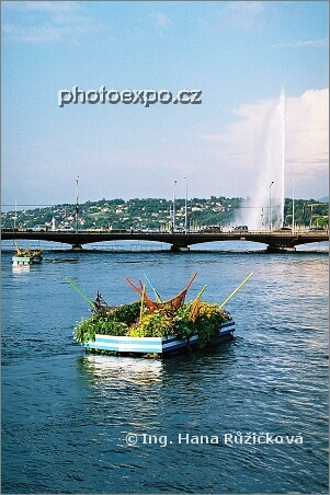 Květinové vory a ženevský symbol - vodotrysk Jet d´Eau tryskající do výše 140 m - na Ženevském jezeře. Ženeva, Švýcarsko.