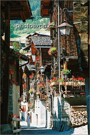 Grimentz, pýcha údolí Anniviers (Val d´Anniviers), žijící skanzen valaiské architektury aneb vesnice se zachovalými a bedlivě udržovanými několikapatrovými dřevěnými domy na kamenné podezdívce, se šindelovými střechami a záplavami rudých muškátů. Vesnicí, která je předmětem zájmu světových filmařů, vede jedna "hlavní cesta". Při procházce Grimentzem pravděpodobně zjistíte, že domy v této vesnici, jsou o něco větší, než jste při prvním pohledu na obec předpokládali... Grimentz, Valais (frankofonní část kantonu), Švýcarsko.