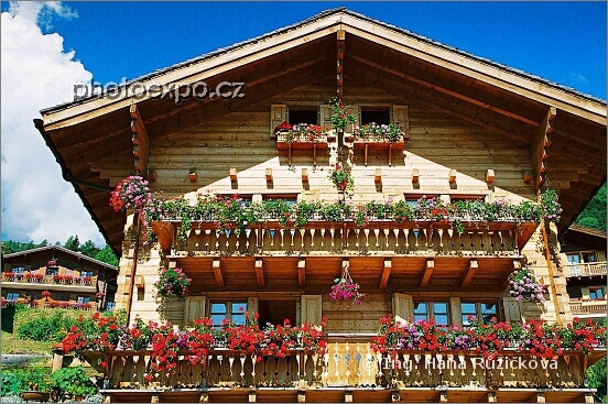 Jeden z novějších domů ve starobylé dřevěné vesnici Grimentz. Údolí Anniviers (Val d´Anniviers), Valais, Švýcarsko.
