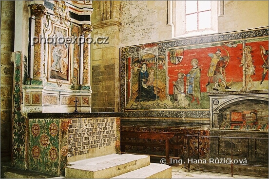 Interiér s freskami v chrámu Notre-Dame de-Valére uvnitř Château de Valère, jedné ze dvou hradních dominant města Sion. Valais, Švýcarsko.