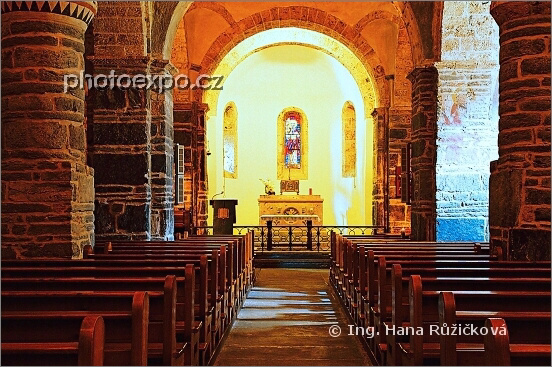 Magický interiér románského kostela v Saint-Pierre-de-Clages z 11. století. Naleznete zde sloupy tří různých tvarů - prvně minete čtyři sloupy čtvercového průřezu, poté dva kruhové, z nichž levý je zdoben starobylou malbou "vlčích zubů" a nakonec, u oltáře, čtyři soupy s profilem ve tvaru kříže. Valais, Švýcarsko.
