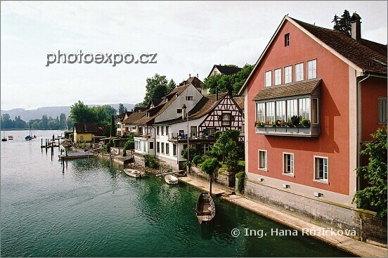 Idylicky poklidný levý břeh Rýna v malovaném městečku Stein am Rhein (Stein nad Rýnem). Schaffhausen, Švýcarsko.