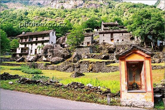 Domy postavené z hrubého kamene bez pojiva. I taková je současná realita některých půvabných částí Švýcarska. Jak ve středověku si budete připadat v údolí Bavona (Val Bavona), údolí tak úzkém, že sem v době od listopadu do února nevnikne ani jeden sluneční paprsek. Nachází se tu 12 terre - vesniček sestávajících z kamenných domů, jejichž součástí bývají i obrovské balvany. Zde vesnice Fontana s kapličkou u silnice. Ticino, Švýcarsko.
