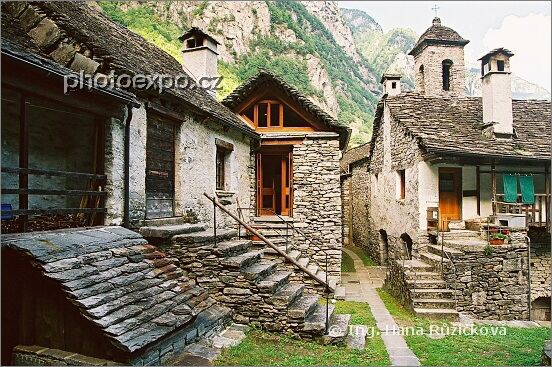 Domy postavené z hrubého kamene bez pojiva. I taková je současná realita některých půvabných částí Švýcarska. Jak ve středověku si budete připadat v údolí Bavona (Val Bavona), údolí tak úzkém, že sem v době od listopadu do února nevnikne ani jeden sluneční paprsek. Nachází se tu 12 terre - vesniček sestávajících z kamenných domů, jejichž součástí bývají i obrovské balvany. Zde vesnice Foroglio s náměstíčkem a kostelem na pozadí. Ticino, Švýcarsko.