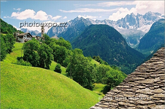 Výhled na půvabnou vesničku Sóglio v údolí Bregáglia, italsky mluvící části Švýcarska. Vpravo detail břidlicové střechy domu stojícího u cesty k vesnici. Graubünden, Švýcarsko.