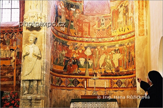 Benediktinka přednáší svůj výklad nadšeným turistům obdivujícím starobylé fresky a další výzdobu v klášteře sv. Jana v Müstairu, který byl zapsán na seznam UNESCO. Graubünden, Švýcarsko.