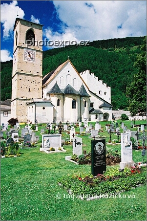 Klášter sv. Jana v Müstairu, který je díky jedinečným freskám od r. 1983 zapsán na seznam světového dědictví UNESCO, a jeho přilehlý hřbitůvek. Müstair, Graubünden, Švýcarsko.