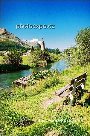 Řeka Inn jako malý potůček na pozadí kostela Sils Baselgia ve vesničce Sils (Segl). Graubünden, Švýcarsko.