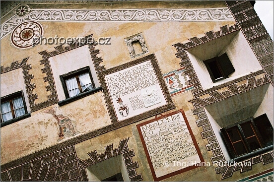 Dům ve vesnici Ardez zdobený sgrafity v podobě renesančních psaníček. Sgrafito se úsměvně překládá jako "vyškrábaná nádhera" - ornamenty, obrazy a renesanční psaníčka byly vyškrábány do vlhké omítky až na spodní vrstvu jiné barvy. Tato dekorace je typická pro domy ve vesnicích Dolního Engadinu. Graubünden, Švýcarsko.