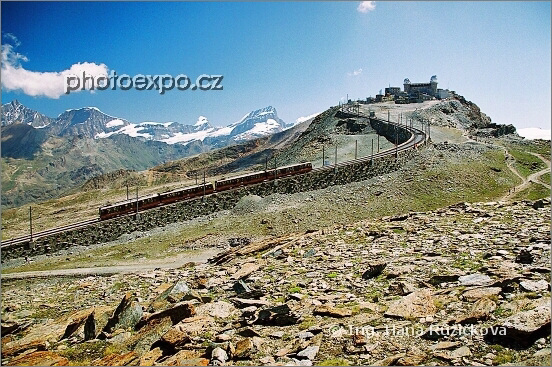 Nejstarší elektrická ozubnicová železnice ve Švýcarsku spojuje Zermatt a Gornergrat (3 089 m n.m.), na jehož vrcholu trůní Kulm Hotel Gornergrat se dvěma observatořemi. Wallis, Švýcarsko.
