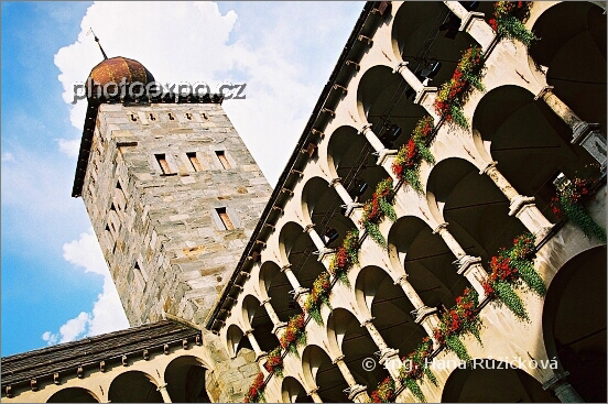 Pohled vzhůru na nádvoří zámku Stockalperů lemované honosnými arkádami. Dominanta města Brig má tři věže zakončené báněmi pojmenovanými Kašpar, Melichar a Baltazar. Wallis, Švýcarsko.