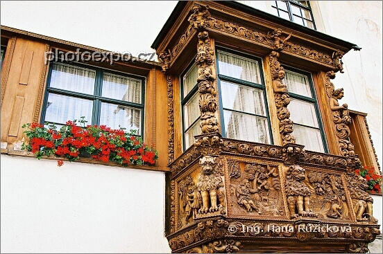Nádherně vyřezávané arkýřové okno se lvy z r. 1680 v St. Gallenu. Švýcarsko