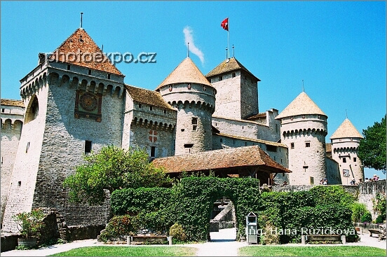 Hrad Chillon (Château de Chillon) je nejnavštěvovanější švýcarskou památkou. Trůní na skalnatém výběžku v nejvýchodnější části Ženevského jezera. Ze břehu má tvář nedobytné hradní pevnosti chráněné vodním příkopem, hradbami a věžemi se střílnami. Ze strany jezera je pak půvabným zámkem. Návštěvníkům zde nabízejí písemného průvodce v češtině! Vaud, Švýcarsko.