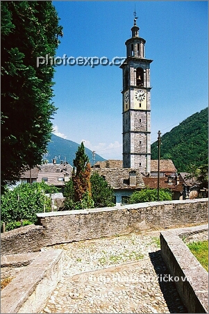 Nejvyšší kostelní věž v Ticinu ční do výše 65 m a náleží baroknímu kostelu v Intragně, administrativním centru Centovalli aneb údolí "Sta údolí". Ticino, Švýcarsko.